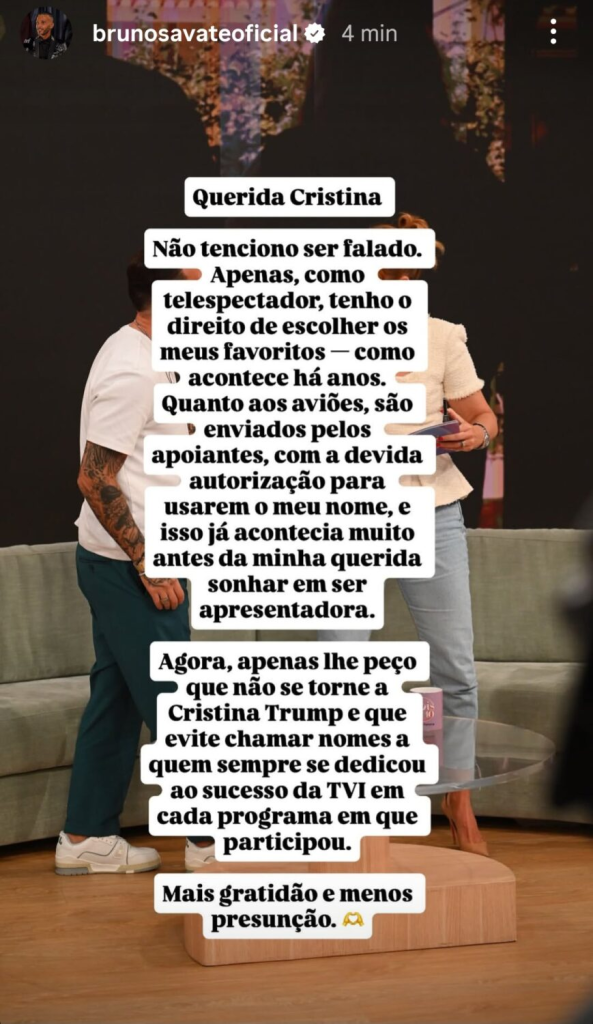 Neste sentido, Bruno Savate também aproveitou a ocasião para fazer um pedido: “Agora, apenas lhe peço que não se torne a Cristina Trump e que evite chamar nomes a quem sempre se dedicou ao sucesso da TVI em cada programa em que participou. Mais gratidão e menos presunção“.