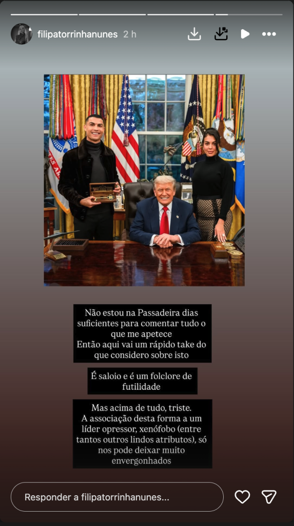 No final, a também psicóloga lamentou este encontro entre o craque português e um dos maiores líderes mundiais: “Mas acima de tudo, triste. A associação desta forma a um líder opressor, xenófobo (entre tantos outros lindos atributos), só nos pode deixar muito envergonhados”.